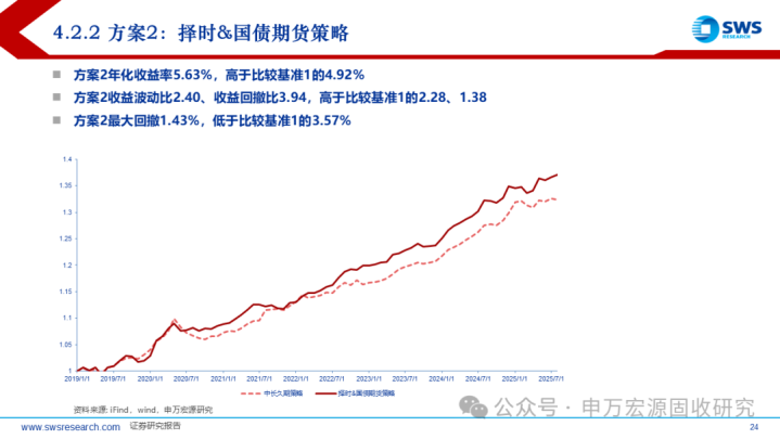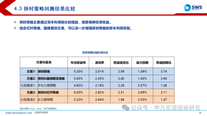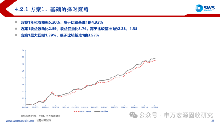 无论从收益率表现,还是从收益波动比、收益回撤比等风险评价维度,2019年以来的回测表明,择时策略方案都优于久期相对更长的比较基准。